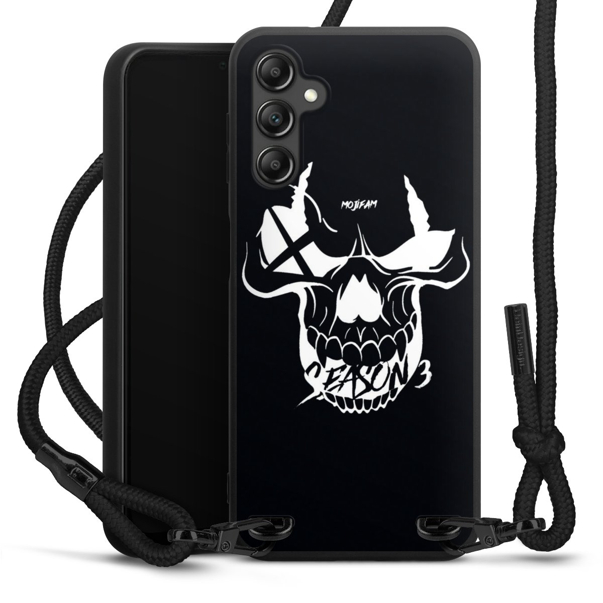 Pure Black: Handyhülle, Stoffband und Metalldetails in stylischem Mattschwarz.