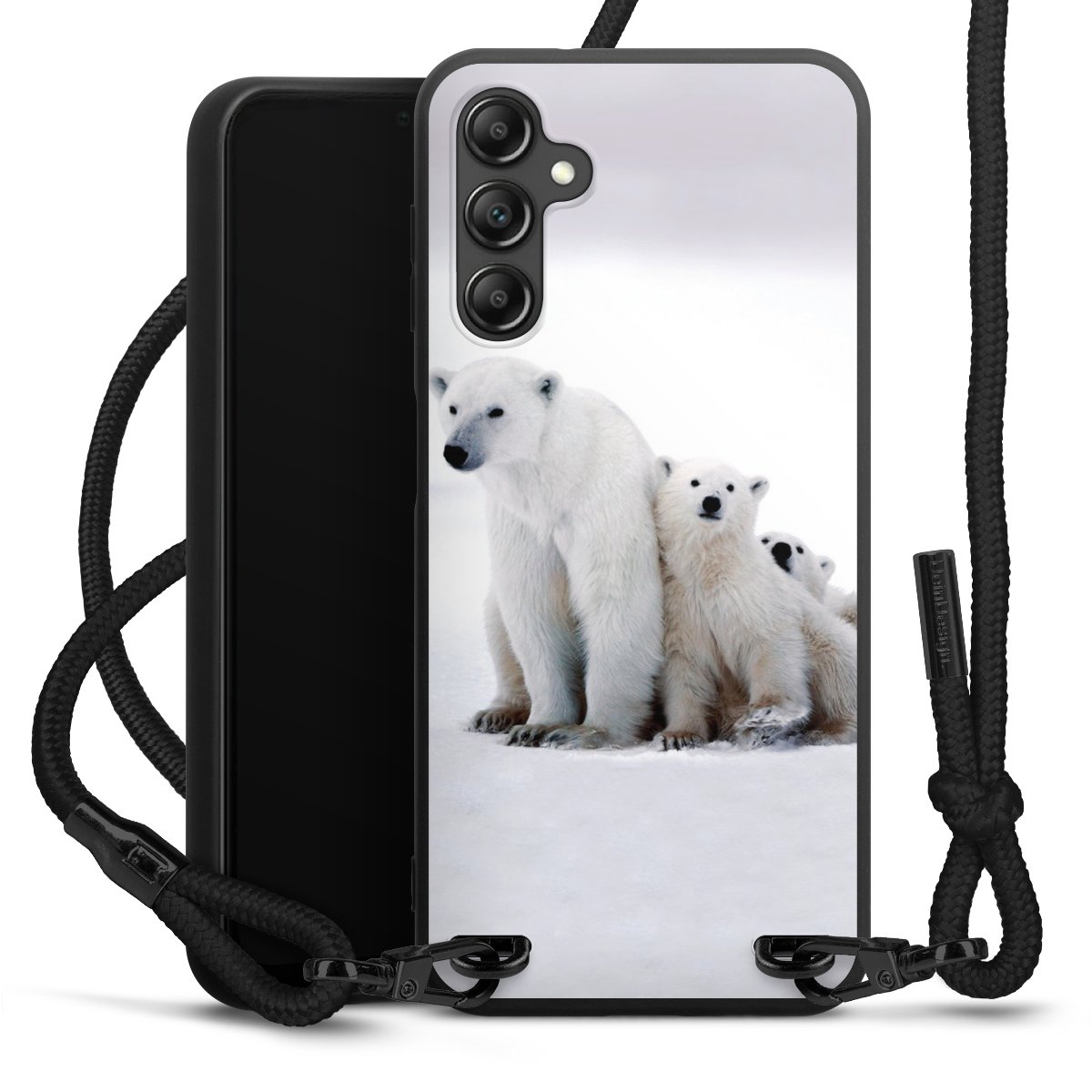 Pure Black: Handyhülle, Stoffband und Metalldetails in stylischem Mattschwarz.
