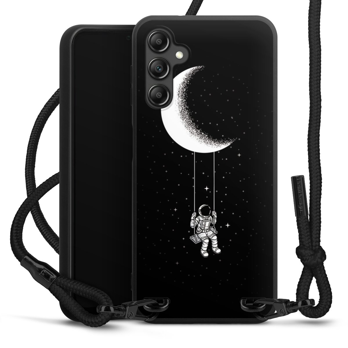 Pure Black: Handyhülle, Stoffband und Metalldetails in stylischem Mattschwarz.
