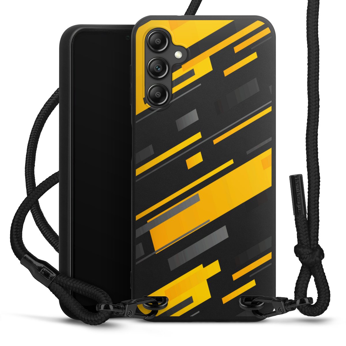 Pure Black: Handyhülle, Stoffband und Metalldetails in stylischem Mattschwarz.