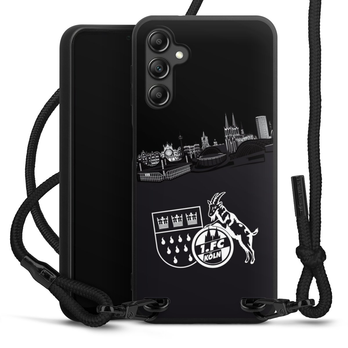 Pure Black: Handyhülle, Stoffband und Metalldetails in stylischem Mattschwarz.