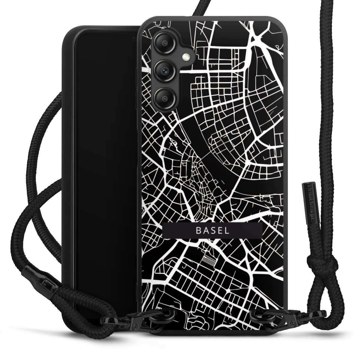 Pure Black: Handyhülle, Stoffband und Metalldetails in stylischem Mattschwarz.