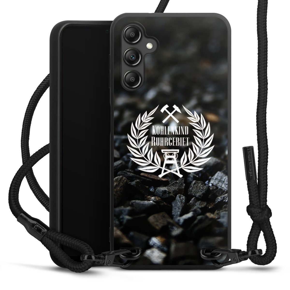 Pure Black: Handyhülle, Stoffband und Metalldetails in stylischem Mattschwarz.