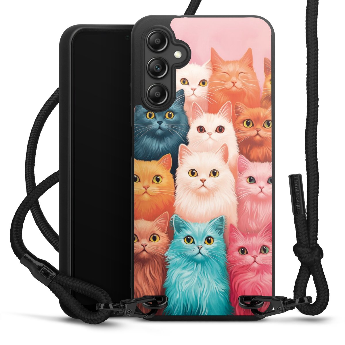 Pure Black: Handyhülle, Stoffband und Metalldetails in stylischem Mattschwarz.