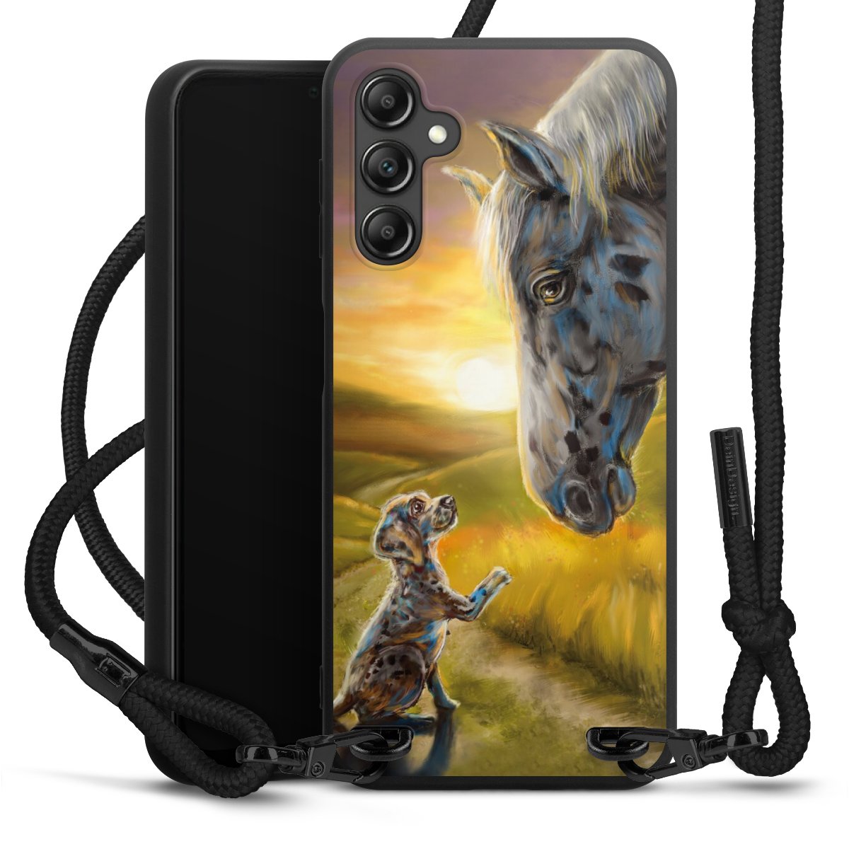 Pure Black: Handyhülle, Stoffband und Metalldetails in stylischem Mattschwarz.