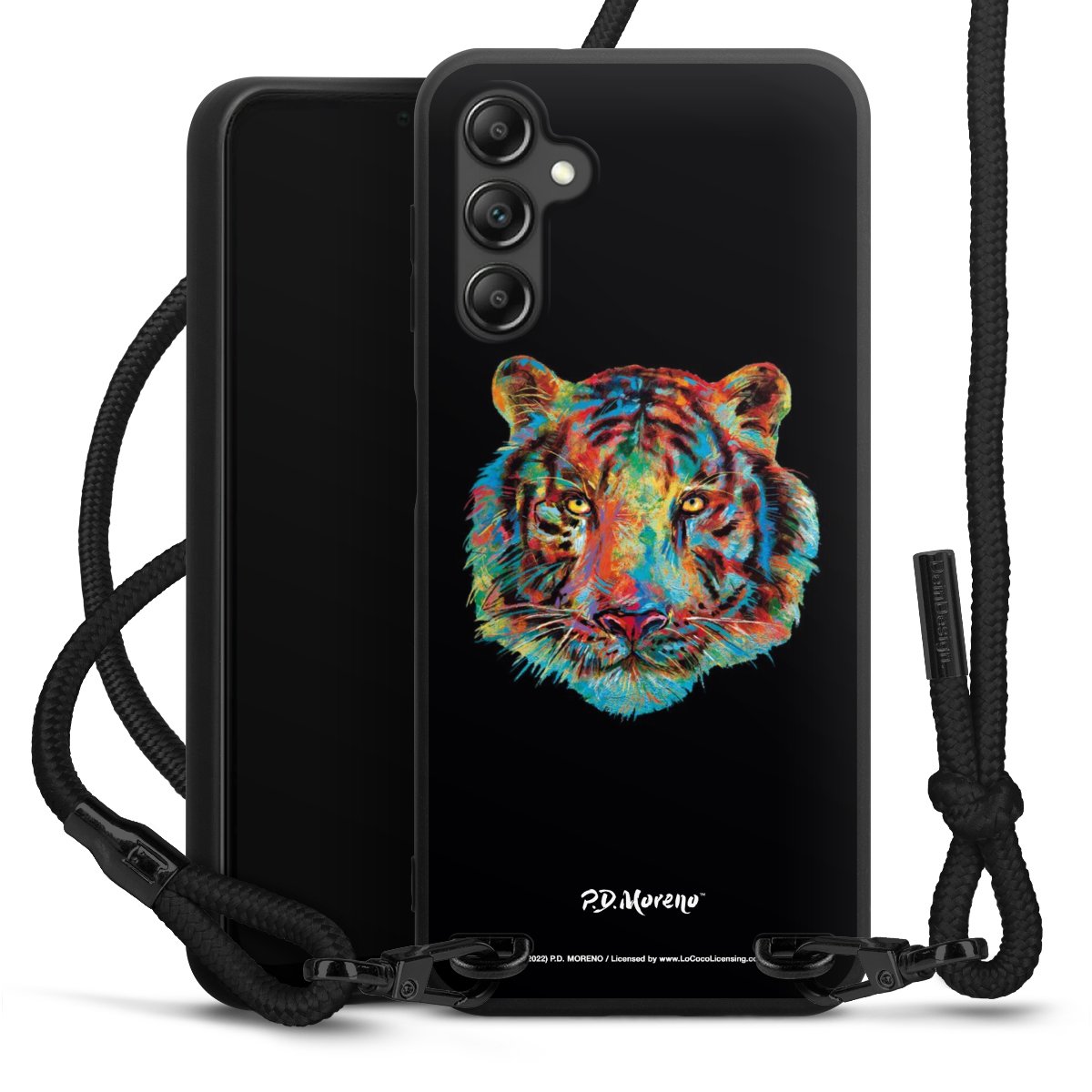 Pure Black: Handyhülle, Stoffband und Metalldetails in stylischem Mattschwarz.