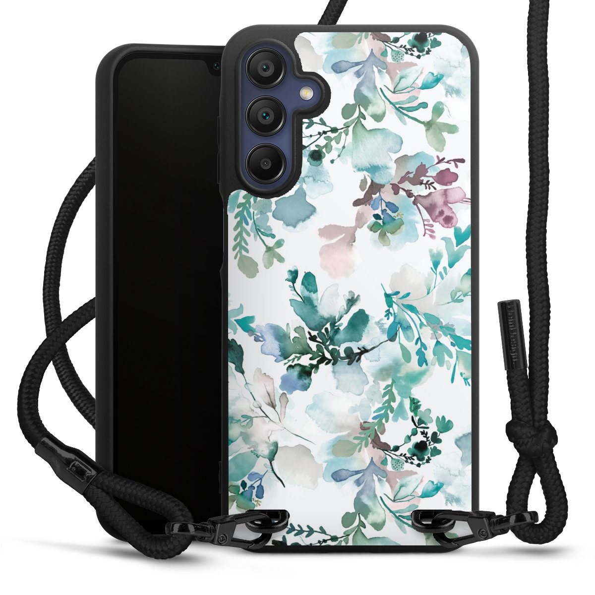 Pure Black: Handyhülle, Stoffband und Metalldetails in stylischem Mattschwarz.