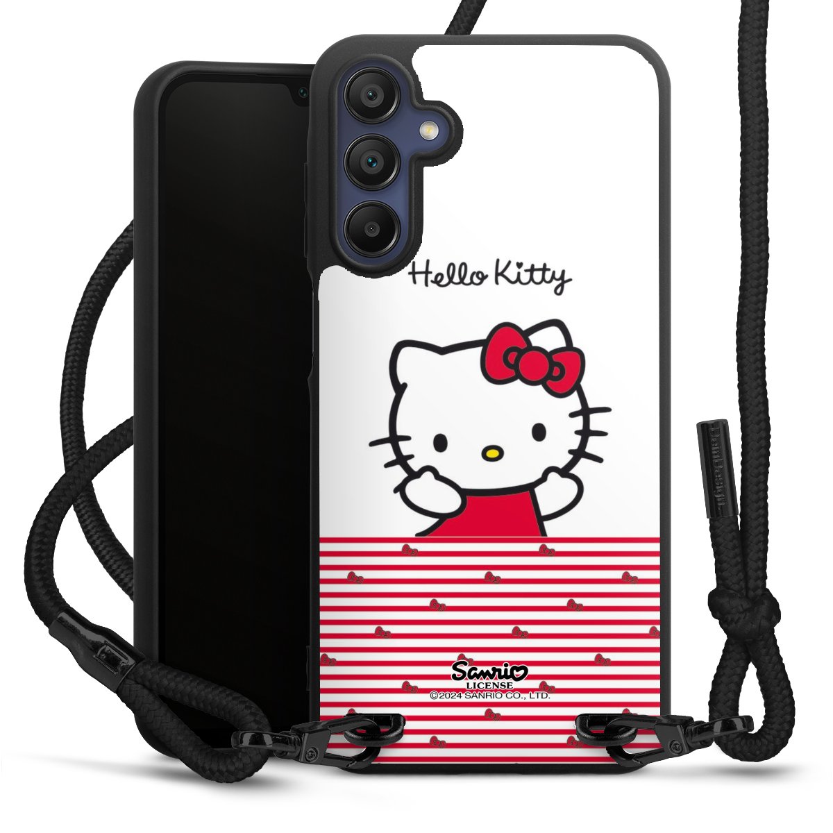 Pure Black: Handyhülle, Stoffband und Metalldetails in stylischem Mattschwarz.