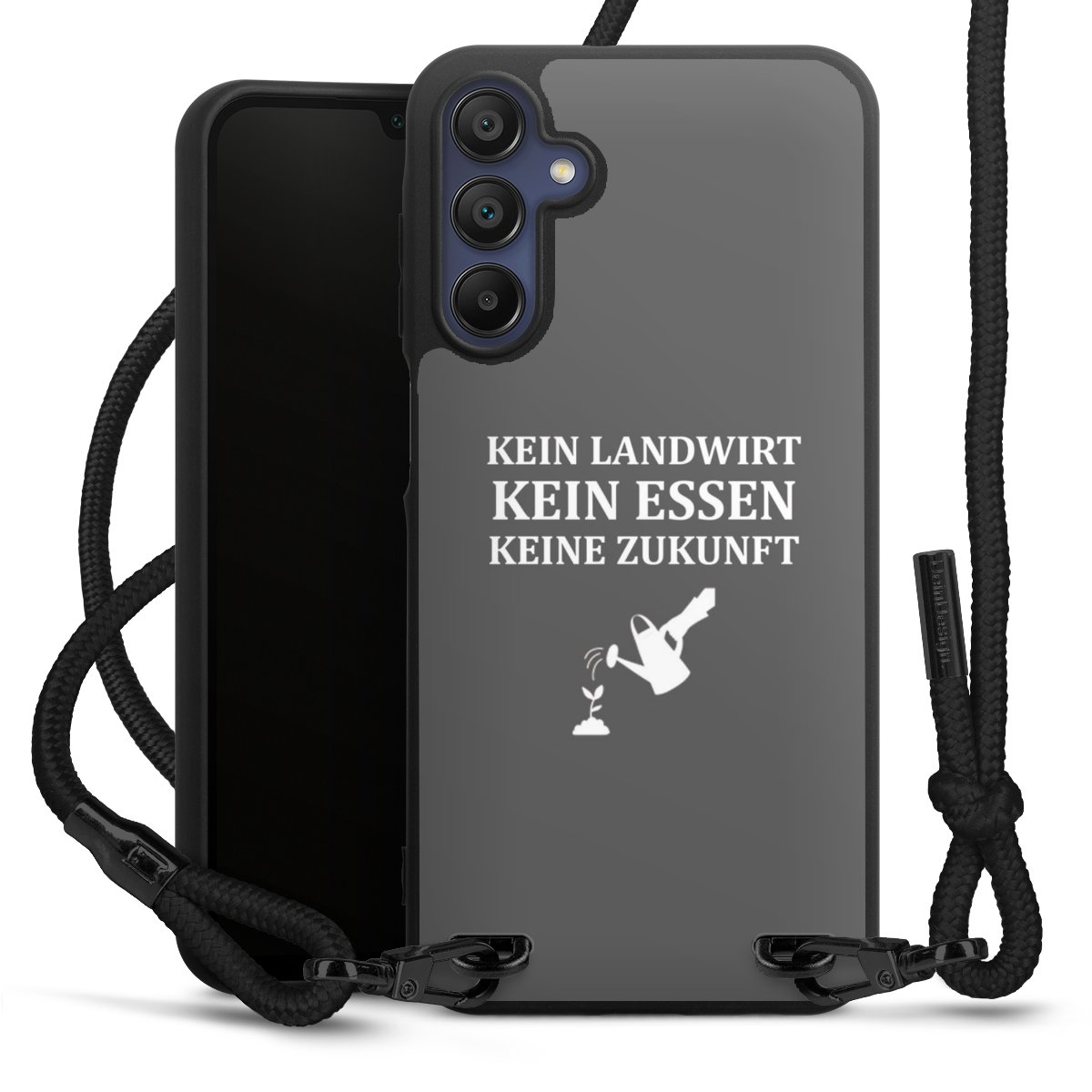 Pure Black: Handyhülle, Stoffband und Metalldetails in stylischem Mattschwarz.