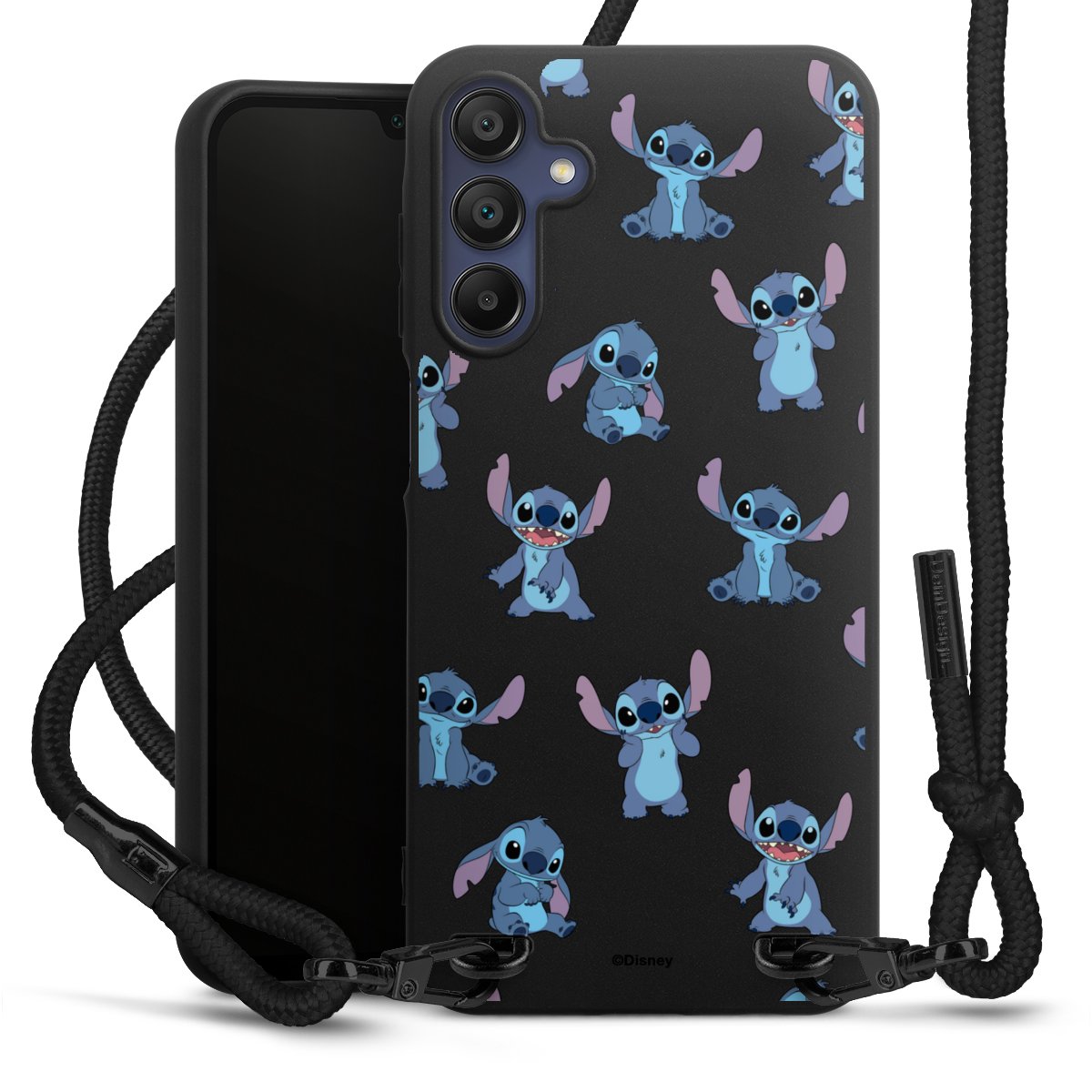 Pure Black: Handyhülle, Stoffband und Metalldetails in stylischem Mattschwarz.