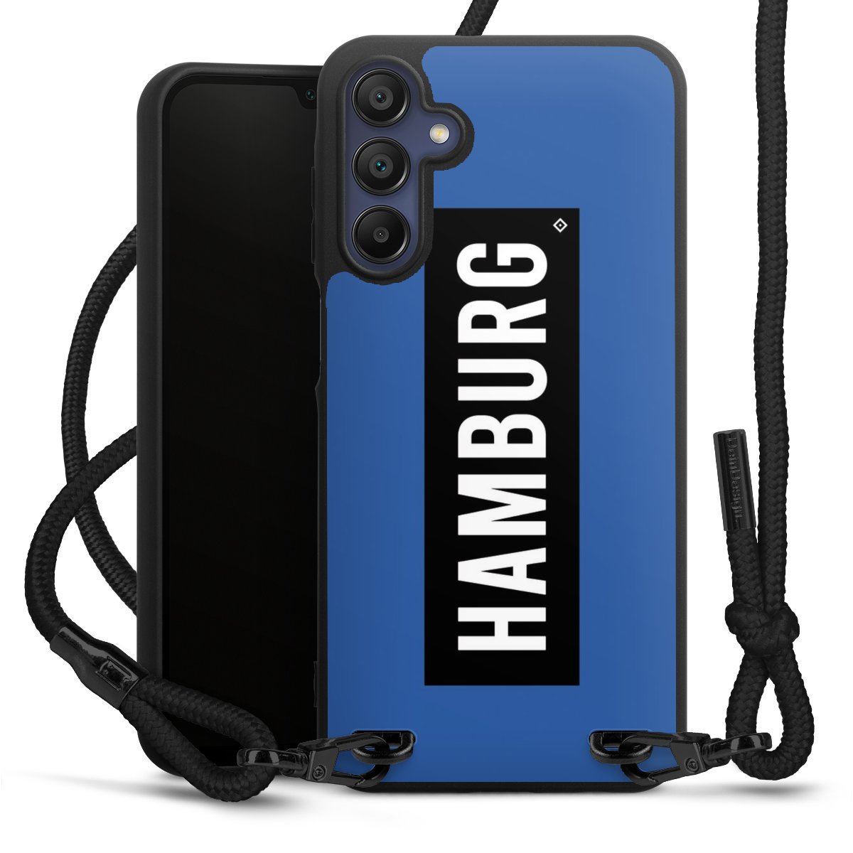 Pure Black: Handyhülle, Stoffband und Metalldetails in stylischem Mattschwarz.