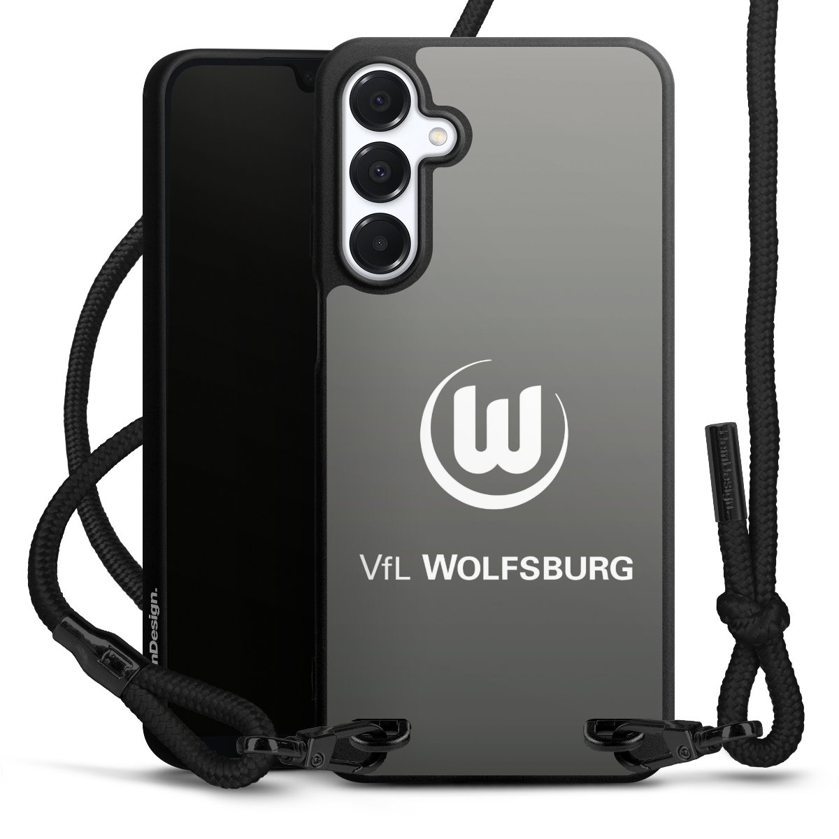 Pure Black: Handyhülle, Stoffband und Metalldetails in stylischem Mattschwarz.