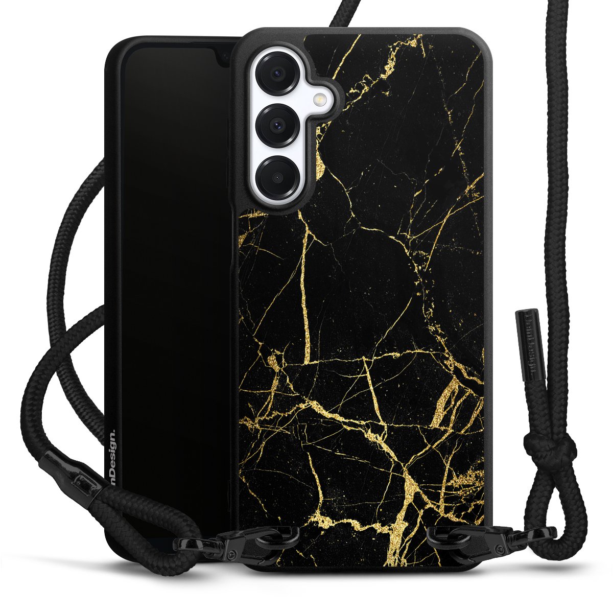 Pure Black: Handyhülle, Stoffband und Metalldetails in stylischem Mattschwarz.