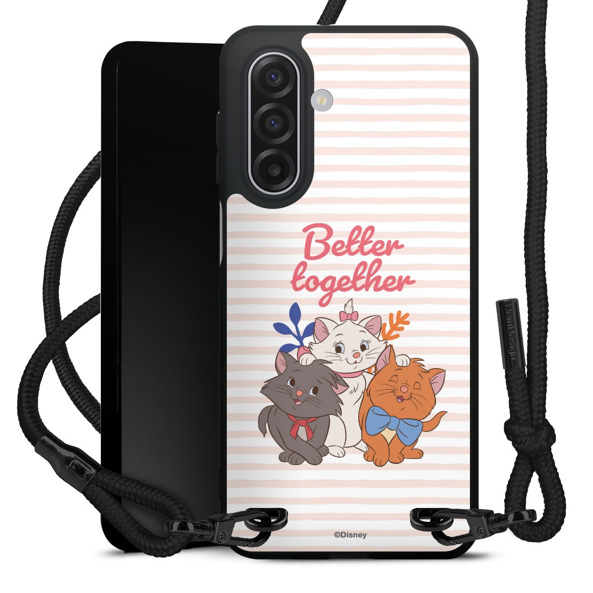 Pure Black: Handyhülle, Stoffband und Metalldetails in stylischem Mattschwarz.