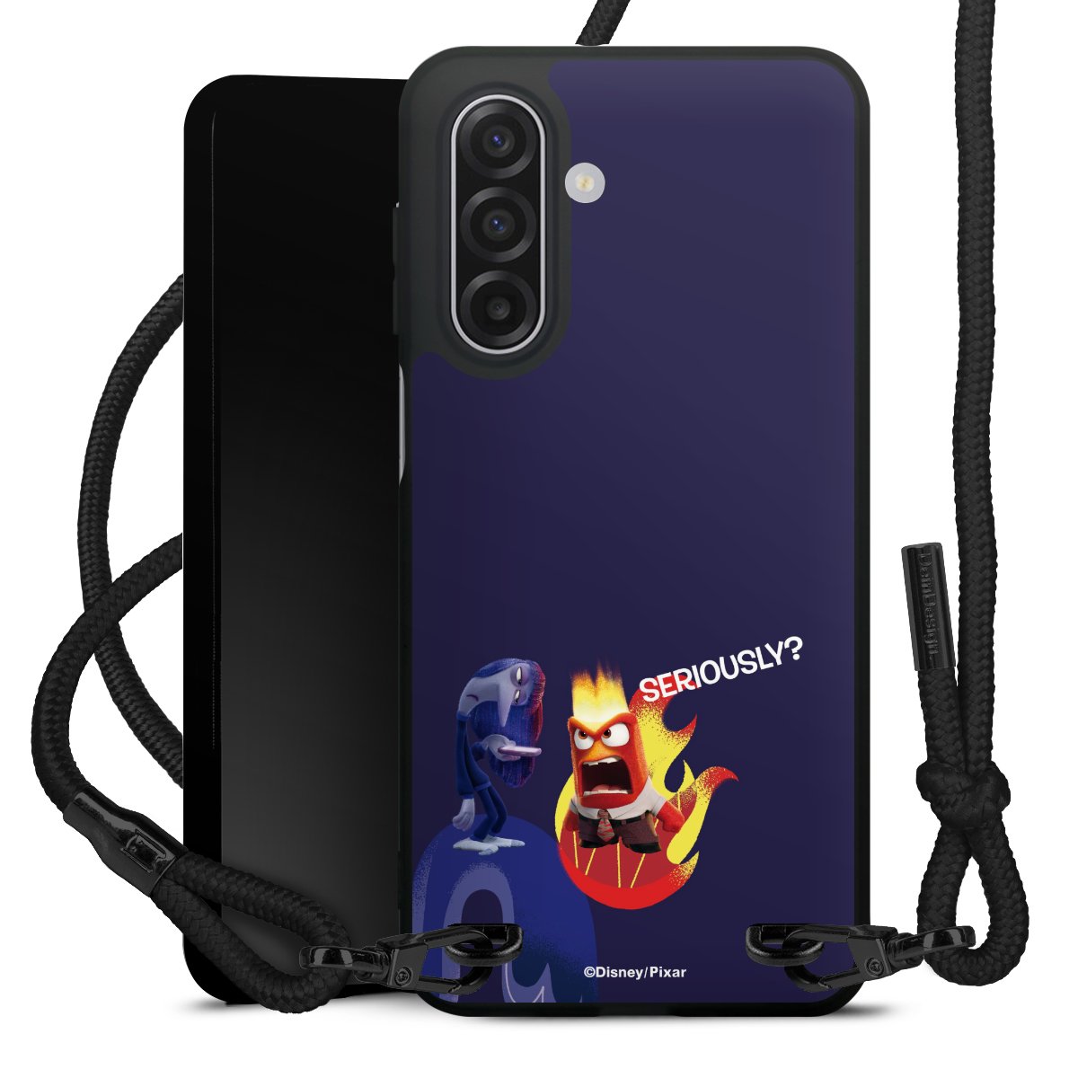 Pure Black: Handyhülle, Stoffband und Metalldetails in stylischem Mattschwarz.