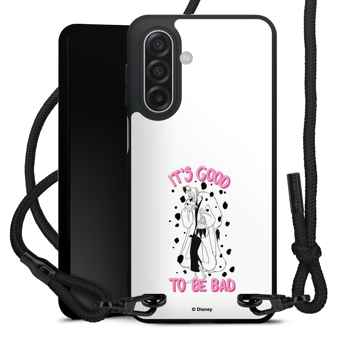 Pure Black: Handyhülle, Stoffband und Metalldetails in stylischem Mattschwarz.