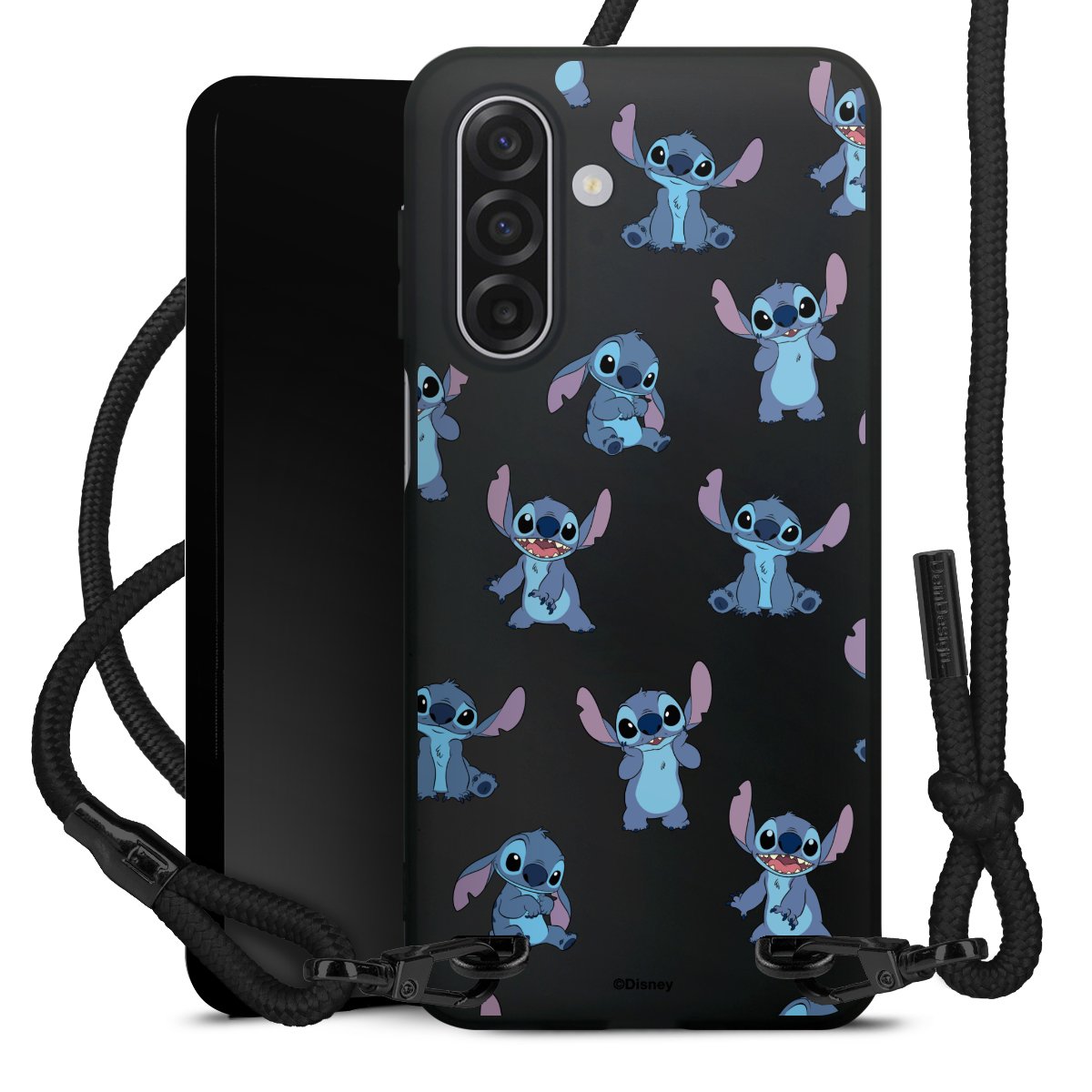 Pure Black: Handyhülle, Stoffband und Metalldetails in stylischem Mattschwarz.