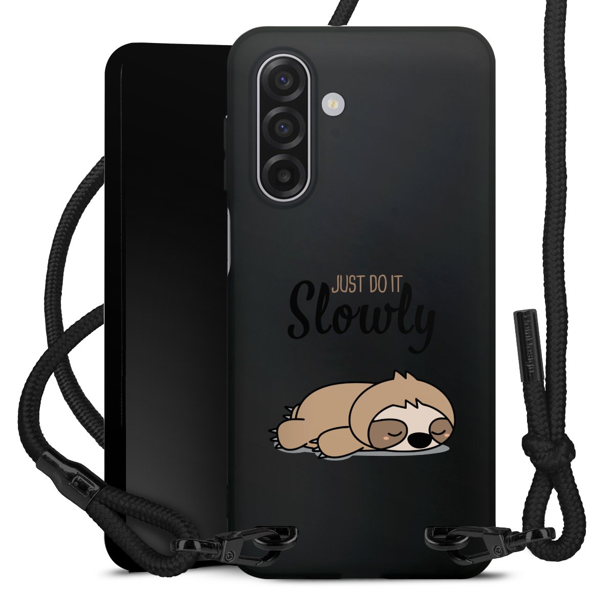 Pure Black: Handyhülle, Stoffband und Metalldetails in stylischem Mattschwarz.