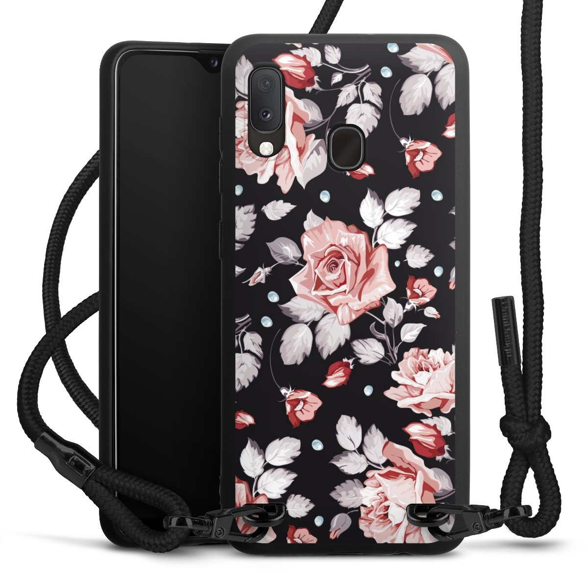 Pure Black: Handyhülle, Stoffband und Metalldetails in stylischem Mattschwarz.