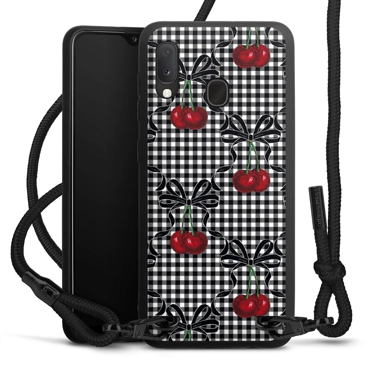 Pure Black: Handyhülle, Stoffband und Metalldetails in stylischem Mattschwarz.