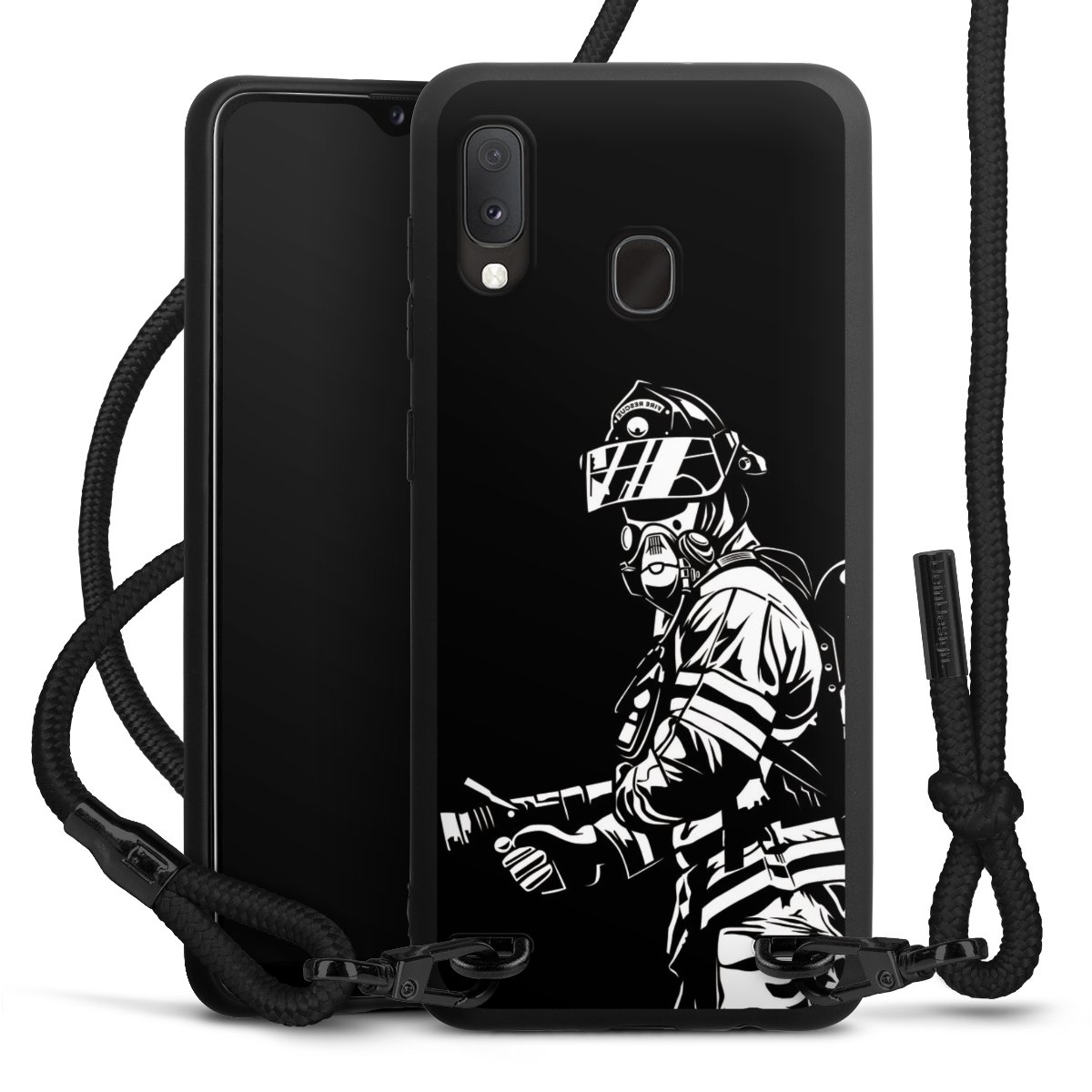 Pure Black: Handyhülle, Stoffband und Metalldetails in stylischem Mattschwarz.