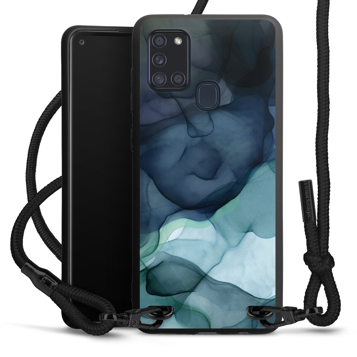 Die mattschwarze Silikonhülle besteht aus flexiblen TPU (thermoplastisches Polyurethan) und bietet robusten Schutz. Durch das langlebige, bruchsichere Material ist die Hülle biegsam und formbeständig zugleich. Die matte Oberfläche lässt Dein Design besser zur Geltung kommen und ist weniger anfällig für Fingerabdrücke und Schmutz. Das stylische Trend-Accessoire liegt griffig in der Hand und wird optimal von der Handykette aus Stoff (Polyester) ergänzt. Das geflochtene Stoffband ist ca. 1,70 Meter lang mit einem Durchmesser von ca. 0,5cm. Aufgrund der besonderen Knotentechnik ist das Band durch einfaches Ziehen in der Länge verstellbar. Als kleines i-Tüpfelchen haben wir das Band mit schicken Metall-Verschlüssen in Mattschwarz versehen.