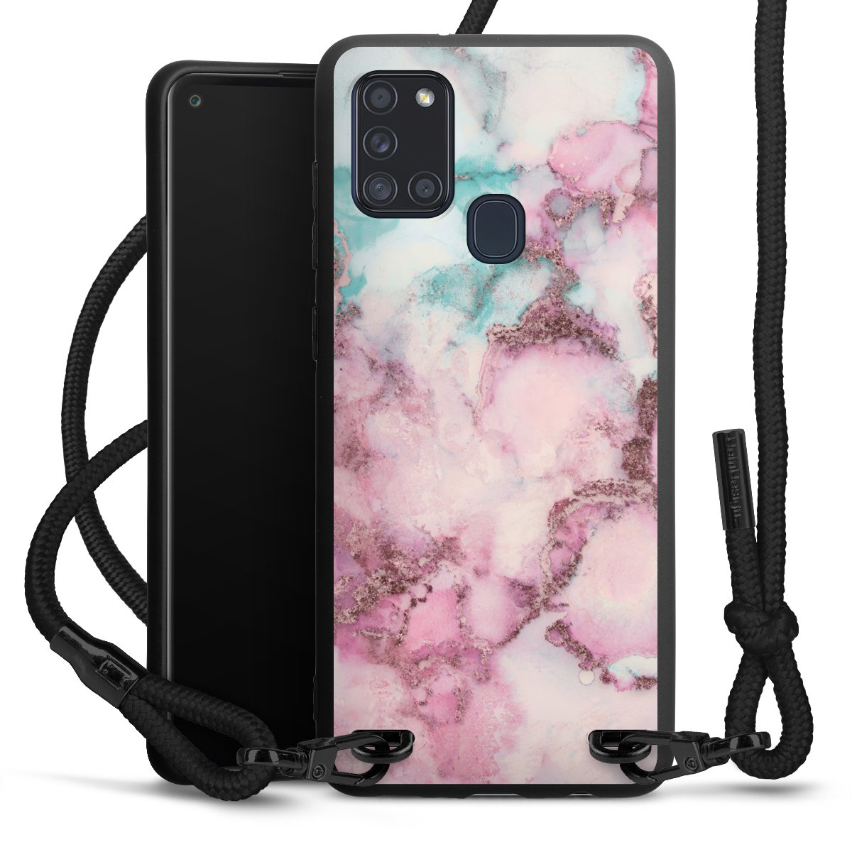 Die mattschwarze Silikonhülle besteht aus flexiblen TPU (thermoplastisches Polyurethan) und bietet robusten Schutz. Durch das langlebige, bruchsichere Material ist die Hülle biegsam und formbeständig zugleich. Die matte Oberfläche lässt Dein Design besser zur Geltung kommen und ist weniger anfällig für Fingerabdrücke und Schmutz. Das stylische Trend-Accessoire liegt griffig in der Hand und wird optimal von der Handykette aus Stoff (Polyester) ergänzt. Das geflochtene Stoffband ist ca. 1,70 Meter lang mit einem Durchmesser von ca. 0,5cm. Aufgrund der besonderen Knotentechnik ist das Band durch einfaches Ziehen in der Länge verstellbar. Als kleines i-Tüpfelchen haben wir das Band mit schicken Metall-Verschlüssen in Mattschwarz versehen.