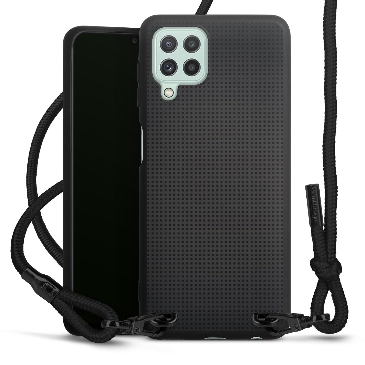 Pure Black: Handyhülle, Stoffband und Metalldetails in stylischem Mattschwarz.