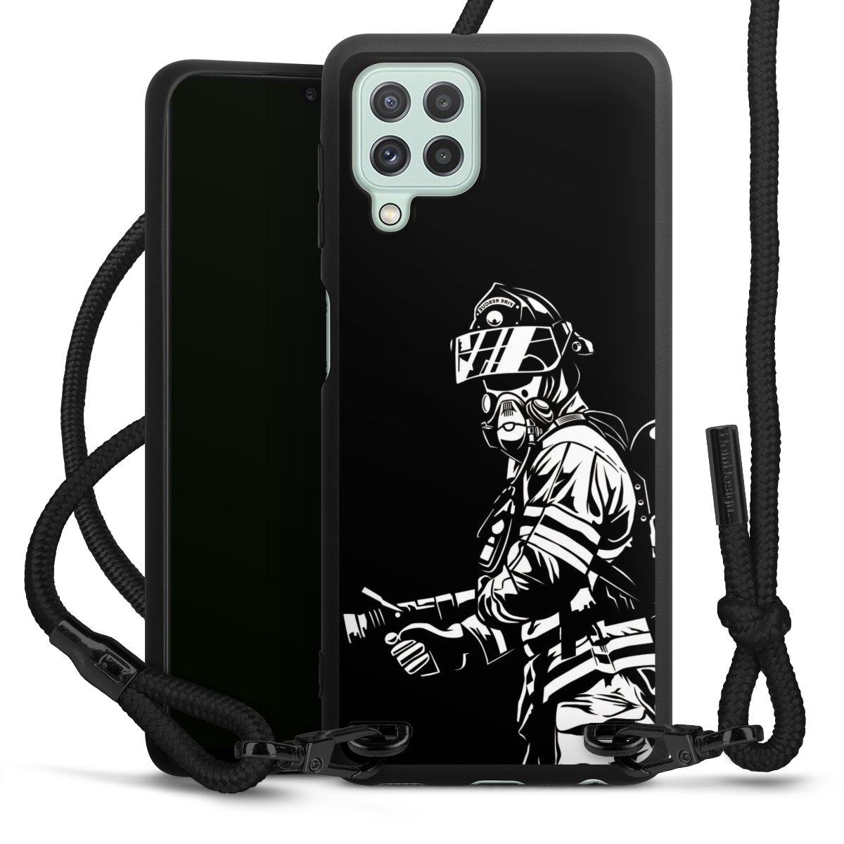 Pure Black: Handyhülle, Stoffband und Metalldetails in stylischem Mattschwarz.
