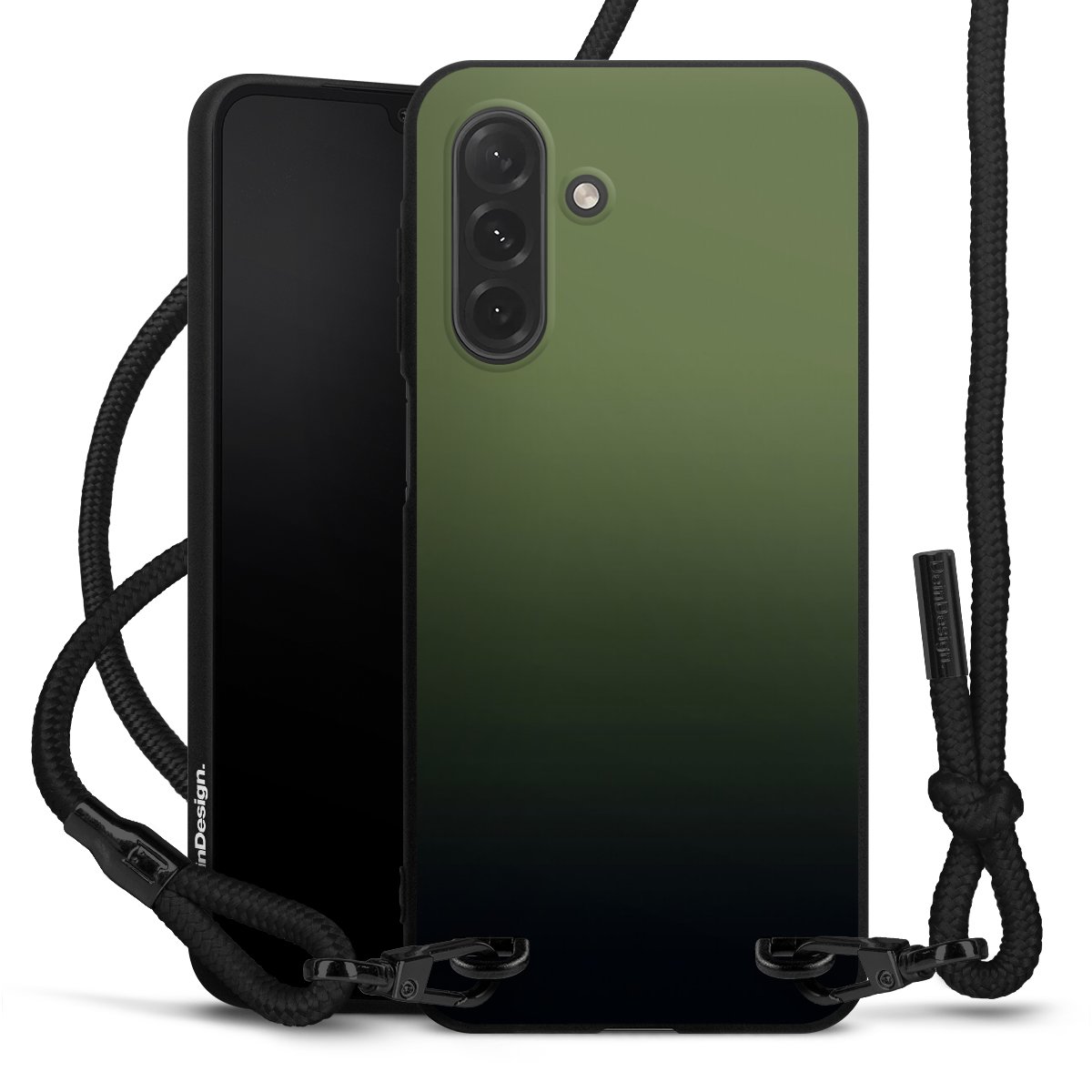 Pure Black: Handyhülle, Stoffband und Metalldetails in stylischem Mattschwarz.