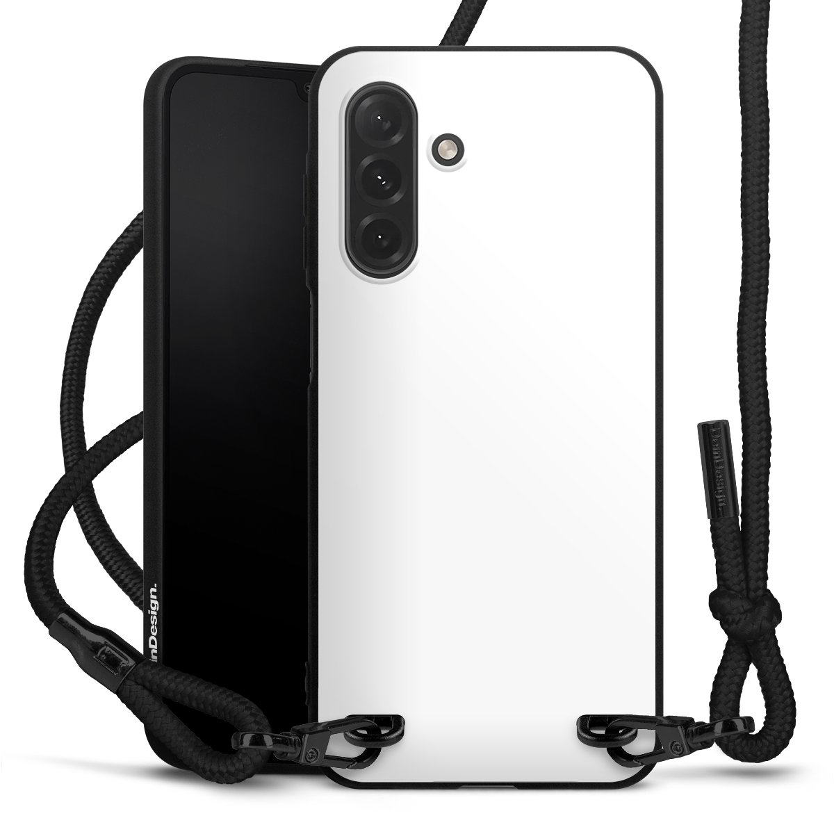 Pure Black: Handyhülle, Stoffband und Metalldetails in stylischem Mattschwarz.