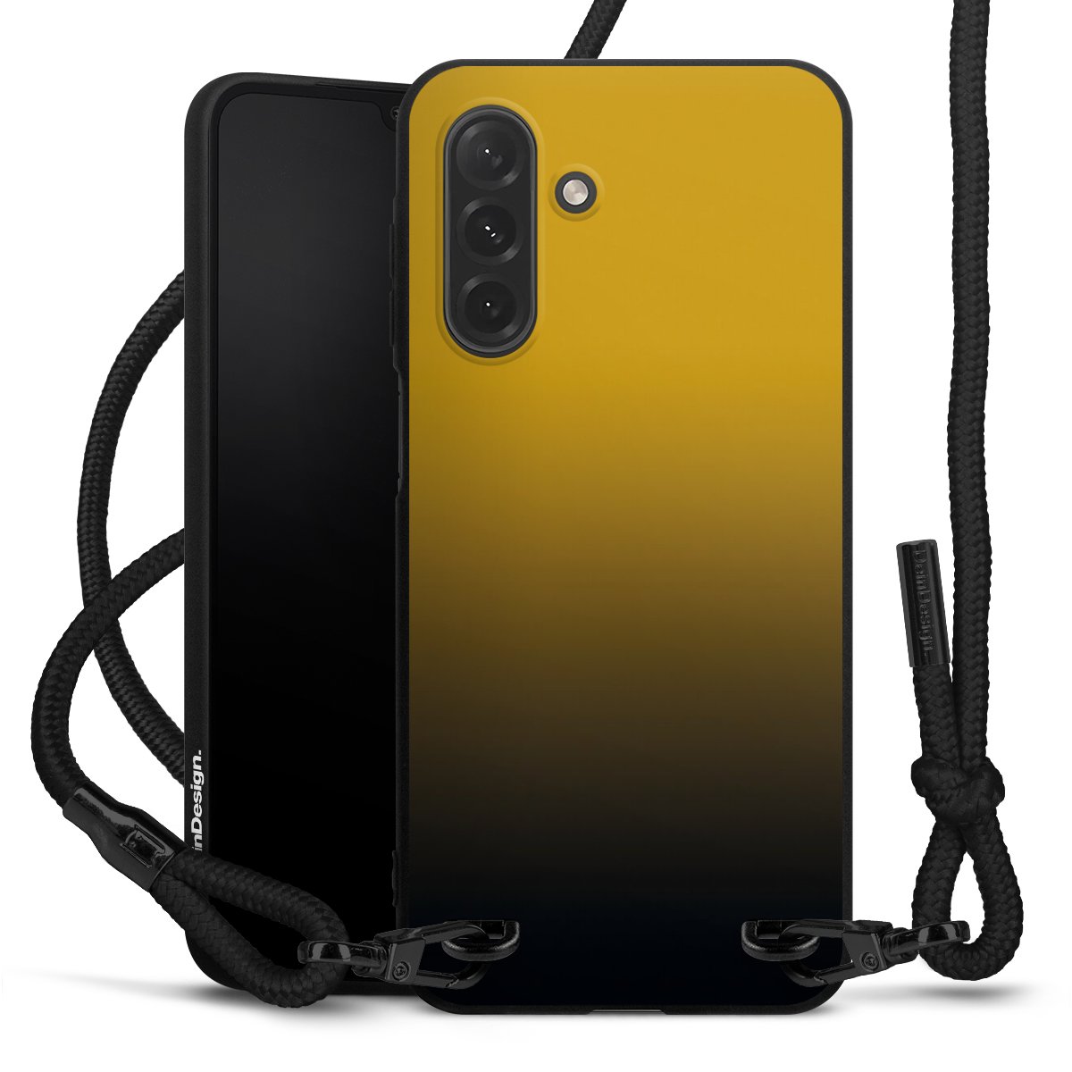 Pure Black: Handyhülle, Stoffband und Metalldetails in stylischem Mattschwarz.