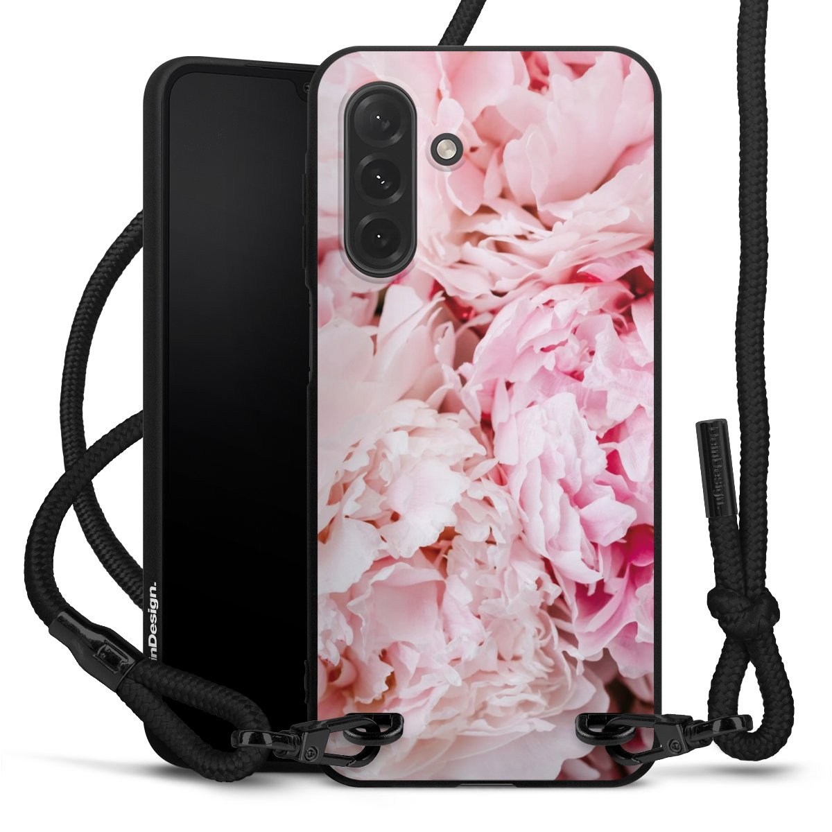 Pure Black: Handyhülle, Stoffband und Metalldetails in stylischem Mattschwarz.