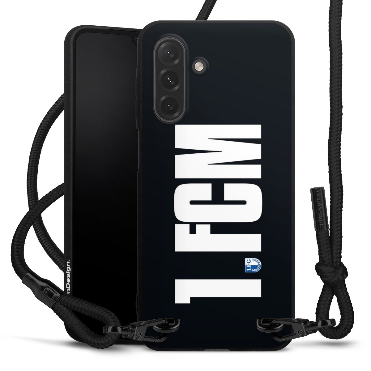Pure Black: Handyhülle, Stoffband und Metalldetails in stylischem Mattschwarz.