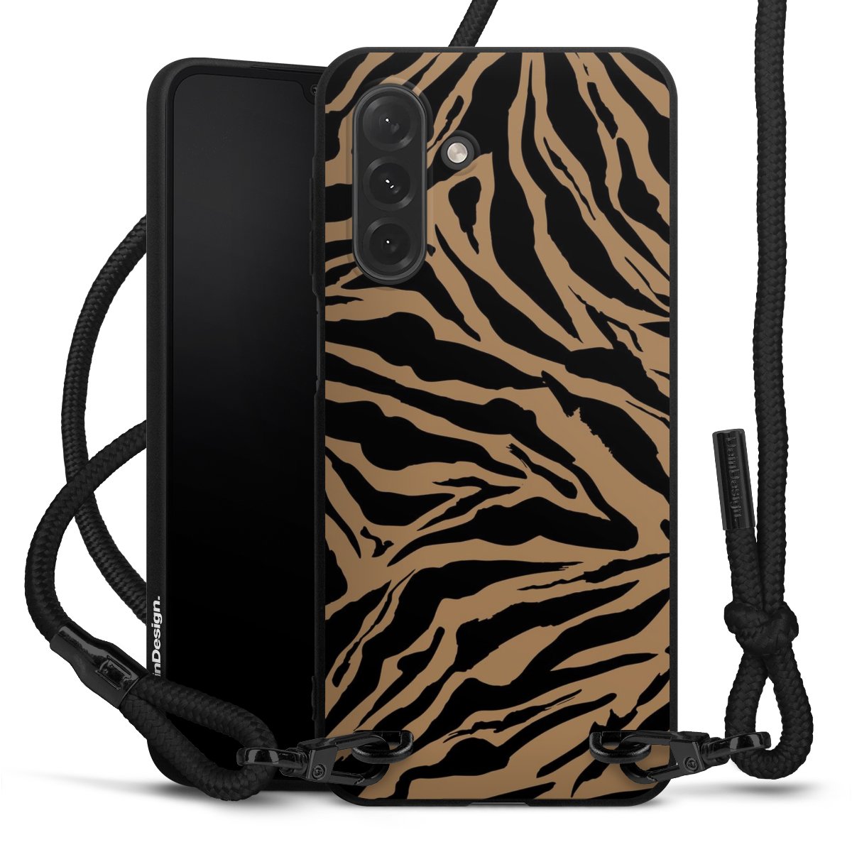 Pure Black: Handyhülle, Stoffband und Metalldetails in stylischem Mattschwarz.