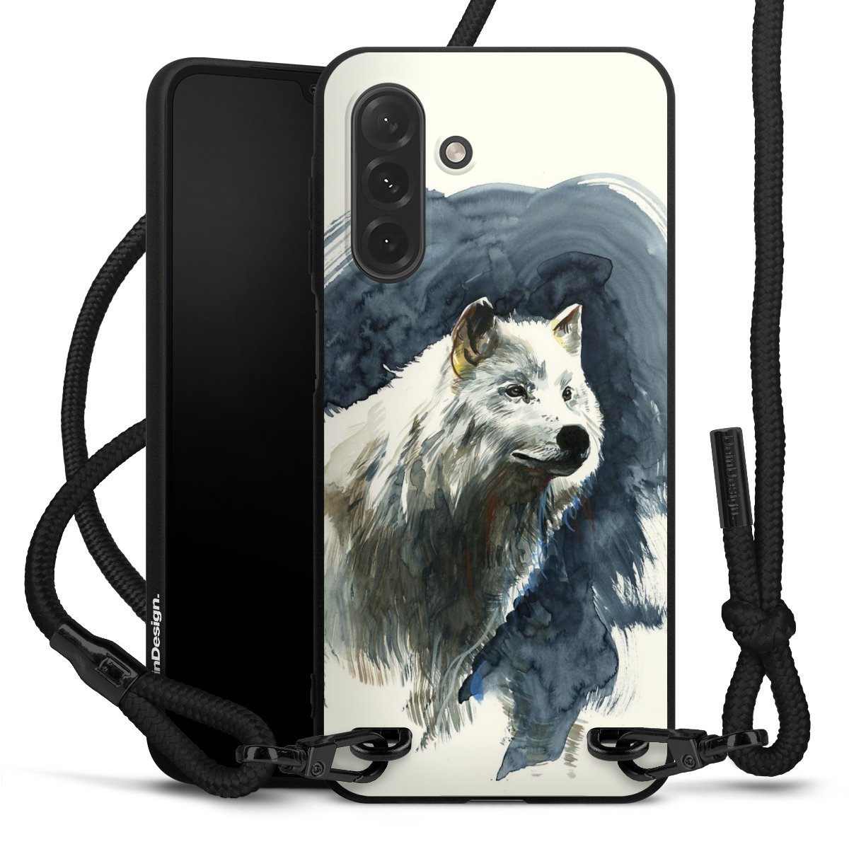 Pure Black: Handyhülle, Stoffband und Metalldetails in stylischem Mattschwarz.