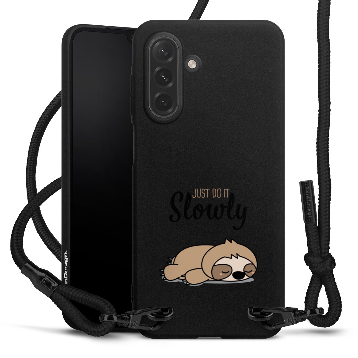 Pure Black: Handyhülle, Stoffband und Metalldetails in stylischem Mattschwarz.