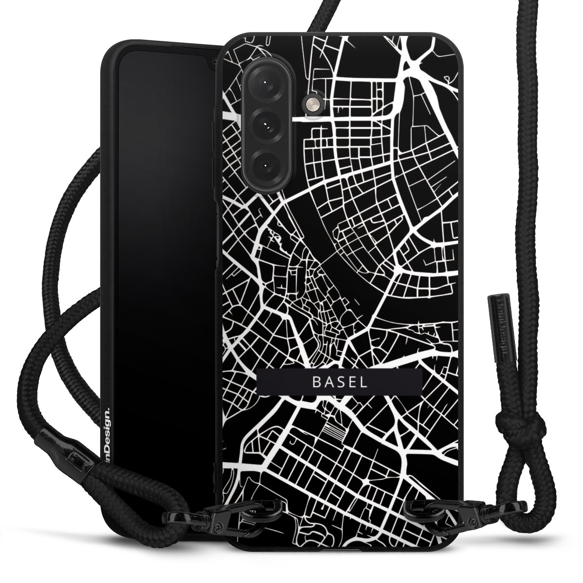 Pure Black: Handyhülle, Stoffband und Metalldetails in stylischem Mattschwarz.