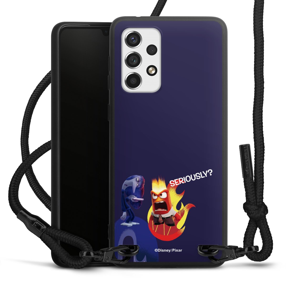 Pure Black: Handyhülle, Stoffband und Metalldetails in stylischem Mattschwarz.