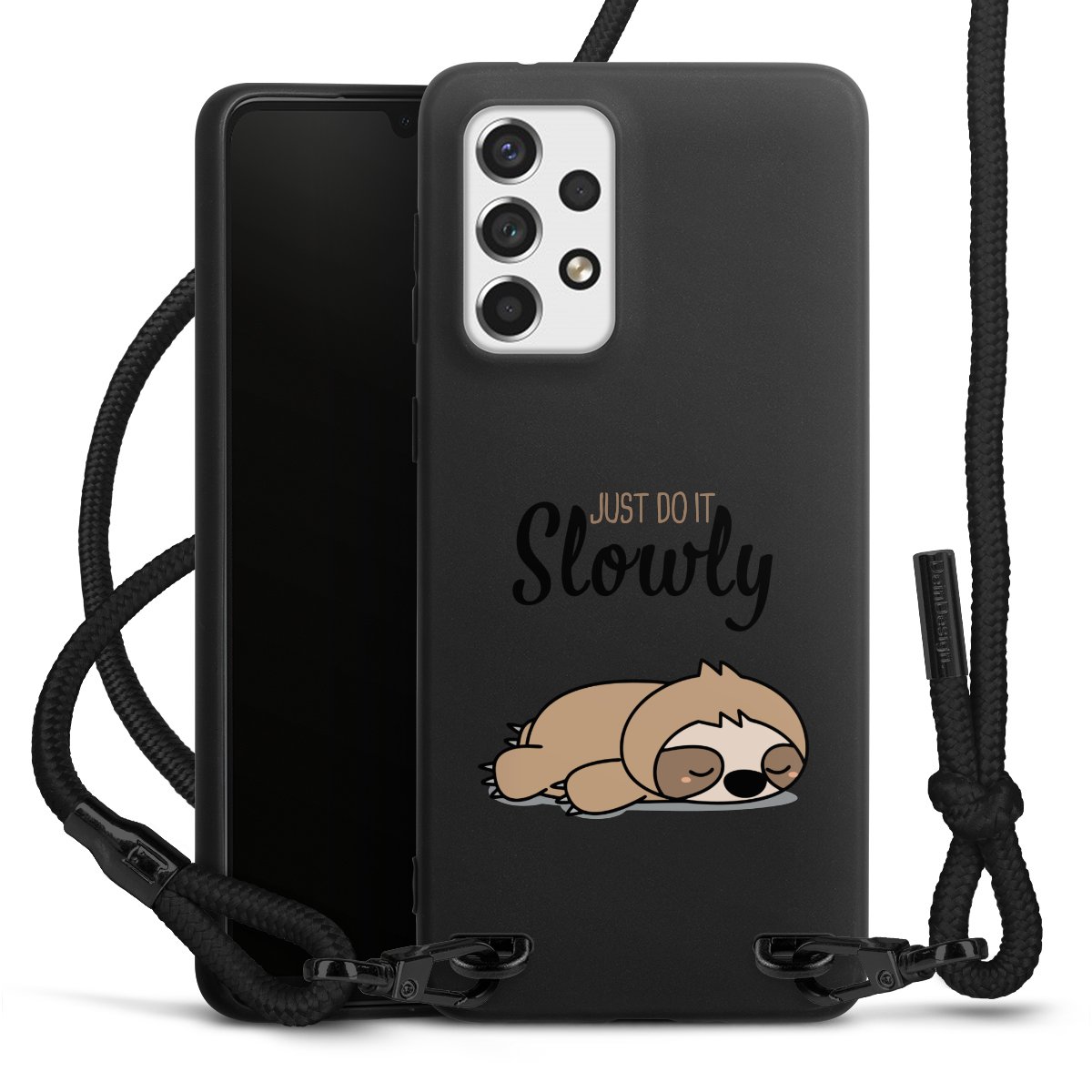 Pure Black: Handyhülle, Stoffband und Metalldetails in stylischem Mattschwarz.