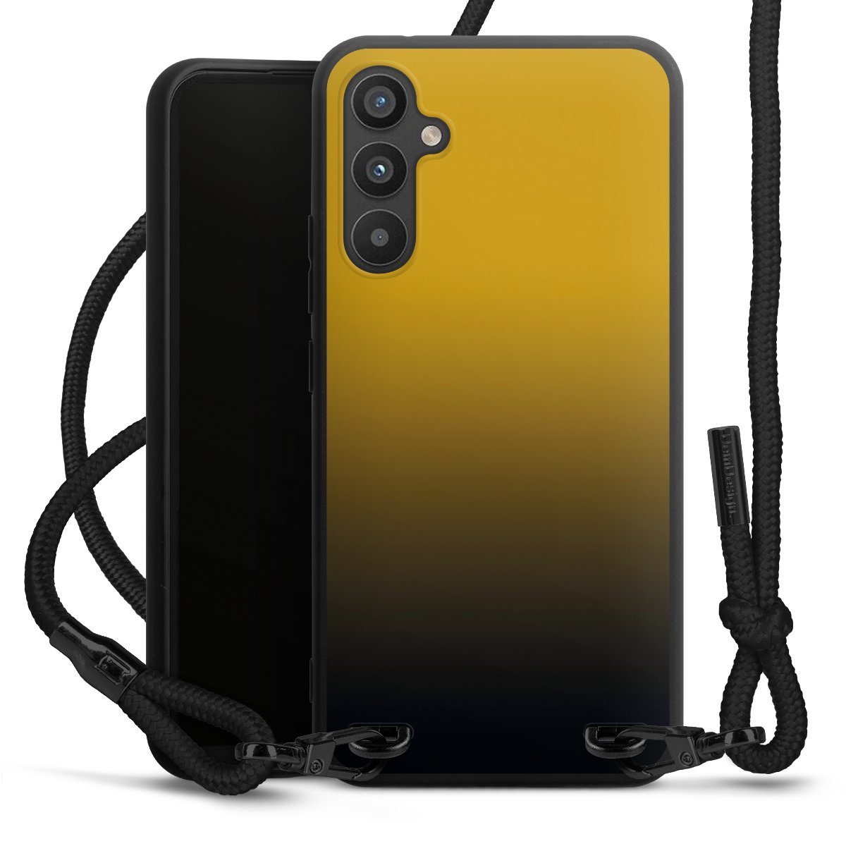 Pure Black: Handyhülle, Stoffband und Metalldetails in stylischem Mattschwarz.