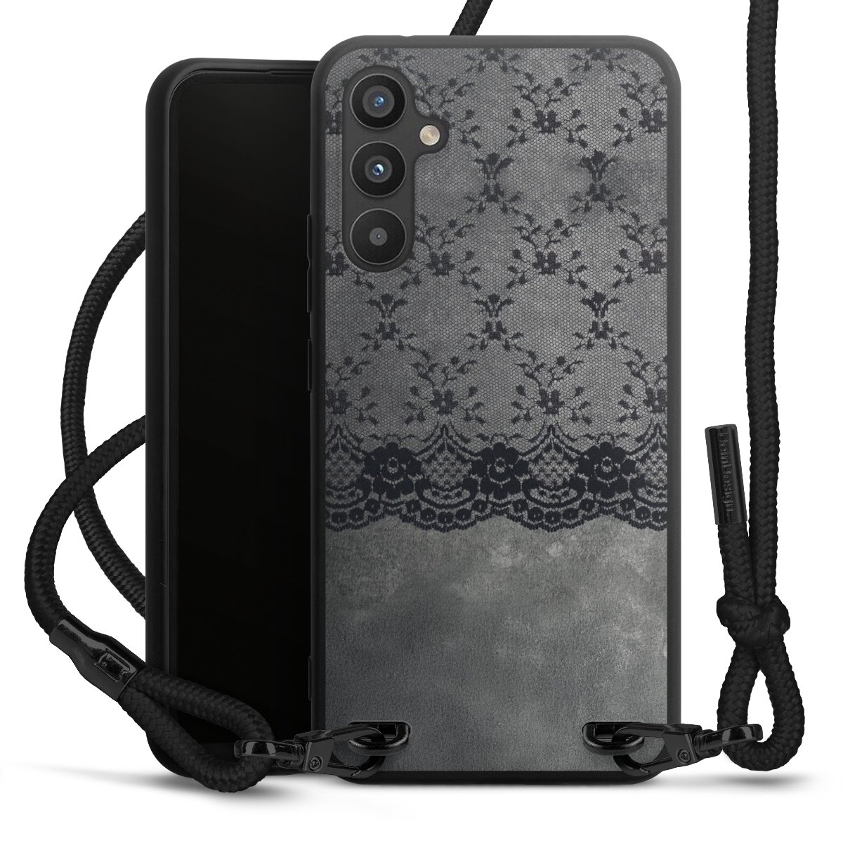 Pure Black: Handyhülle, Stoffband und Metalldetails in stylischem Mattschwarz.