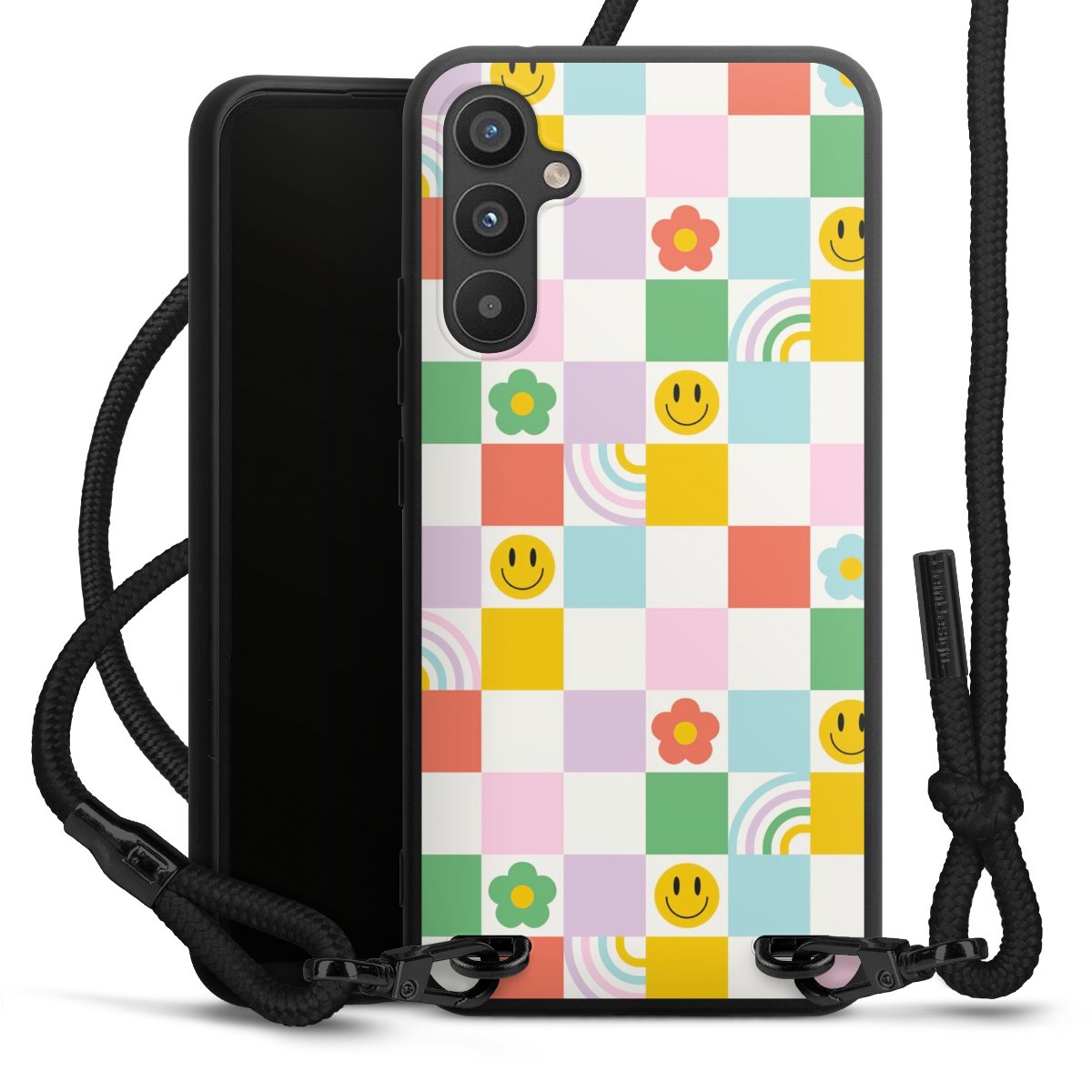 Die mattschwarze Silikonhülle besteht aus flexiblen TPU (thermoplastisches Polyurethan) und bietet robusten Schutz. Durch das langlebige, bruchsichere Material ist die Hülle biegsam und formbeständig zugleich. Die matte Oberfläche lässt Dein Design besser zur Geltung kommen und ist weniger anfällig für Fingerabdrücke und Schmutz. Das stylische Trend-Accessoire liegt griffig in der Hand und wird optimal von der Handykette aus Stoff (Polyester) ergänzt. Das geflochtene Stoffband ist ca. 1,70 Meter lang mit einem Durchmesser von ca. 0,5cm. Aufgrund der besonderen Knotentechnik ist das Band durch einfaches Ziehen in der Länge verstellbar. Als kleines i-Tüpfelchen haben wir das Band mit schicken Metall-Verschlüssen in Mattschwarz versehen.