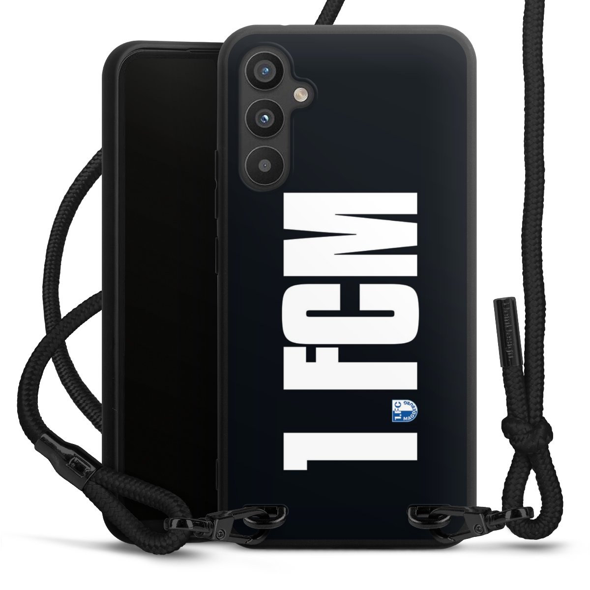 Pure Black: Handyhülle, Stoffband und Metalldetails in stylischem Mattschwarz.