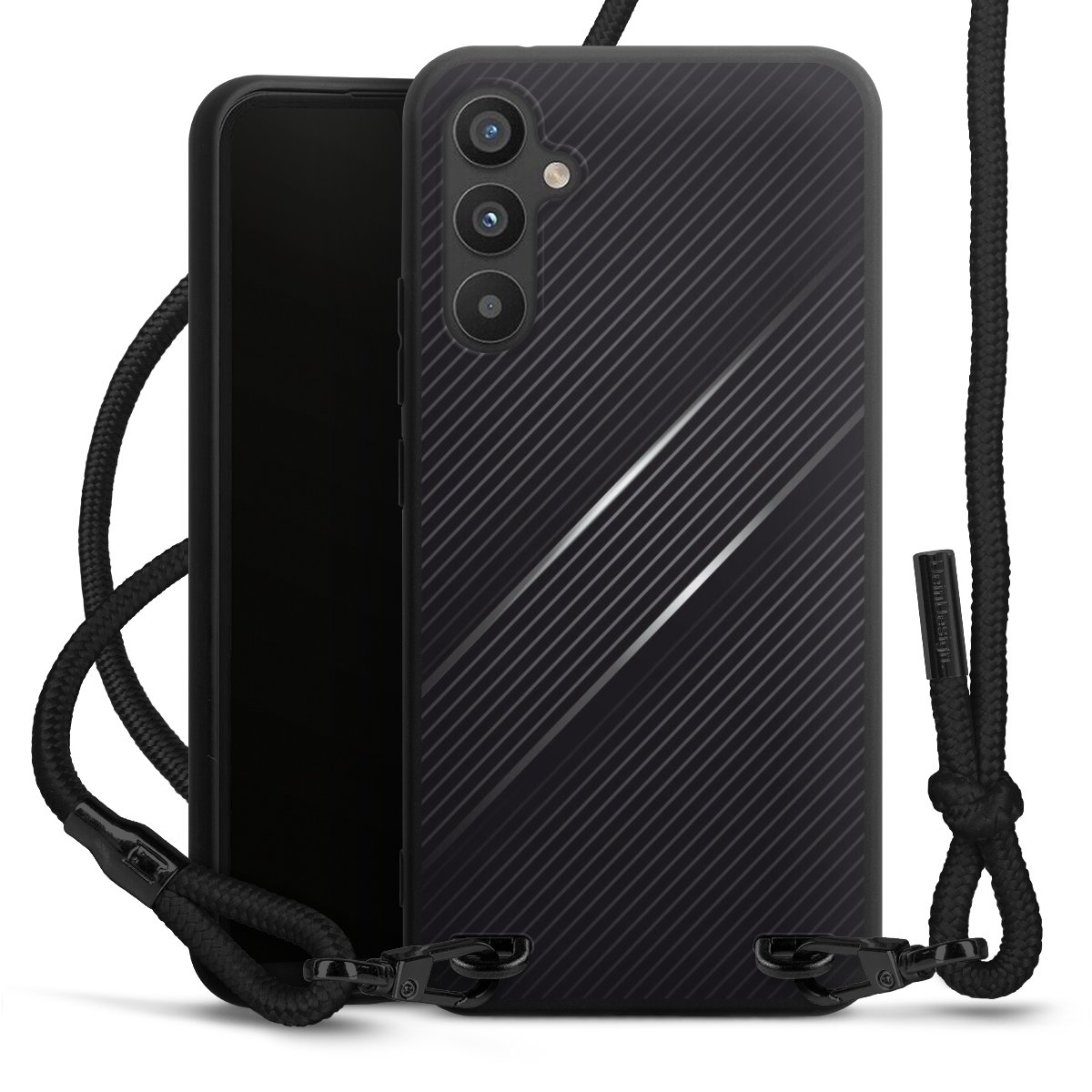 Pure Black: Handyhülle, Stoffband und Metalldetails in stylischem Mattschwarz.