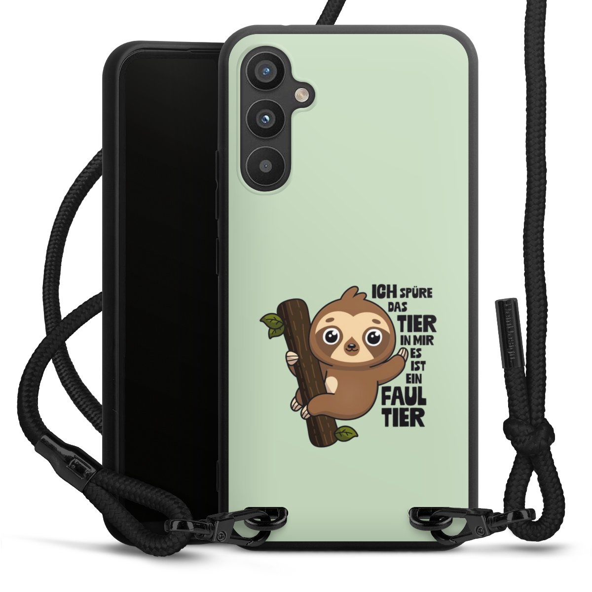 Pure Black: Handyhülle, Stoffband und Metalldetails in stylischem Mattschwarz.