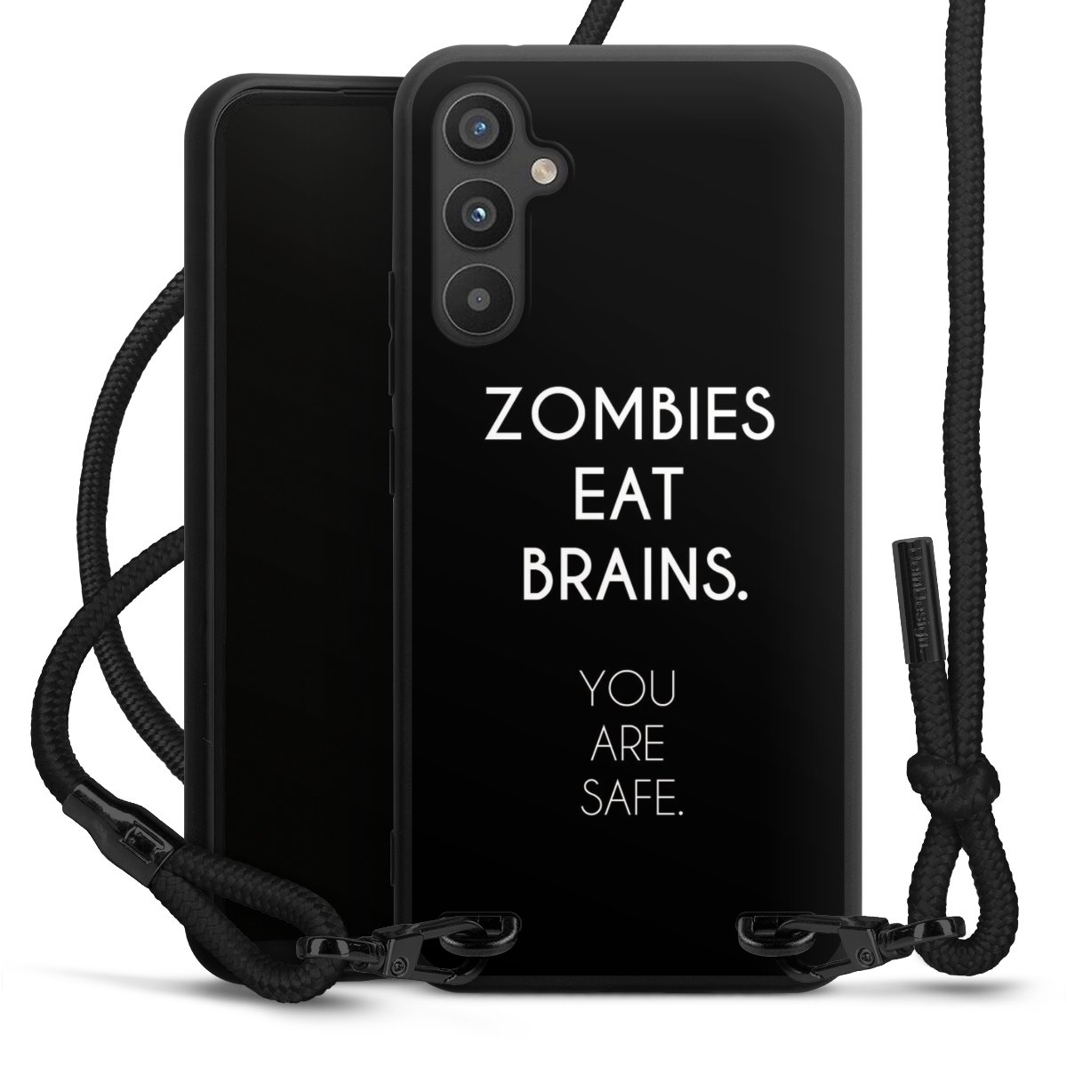 Pure Black: Handyhülle, Stoffband und Metalldetails in stylischem Mattschwarz.
