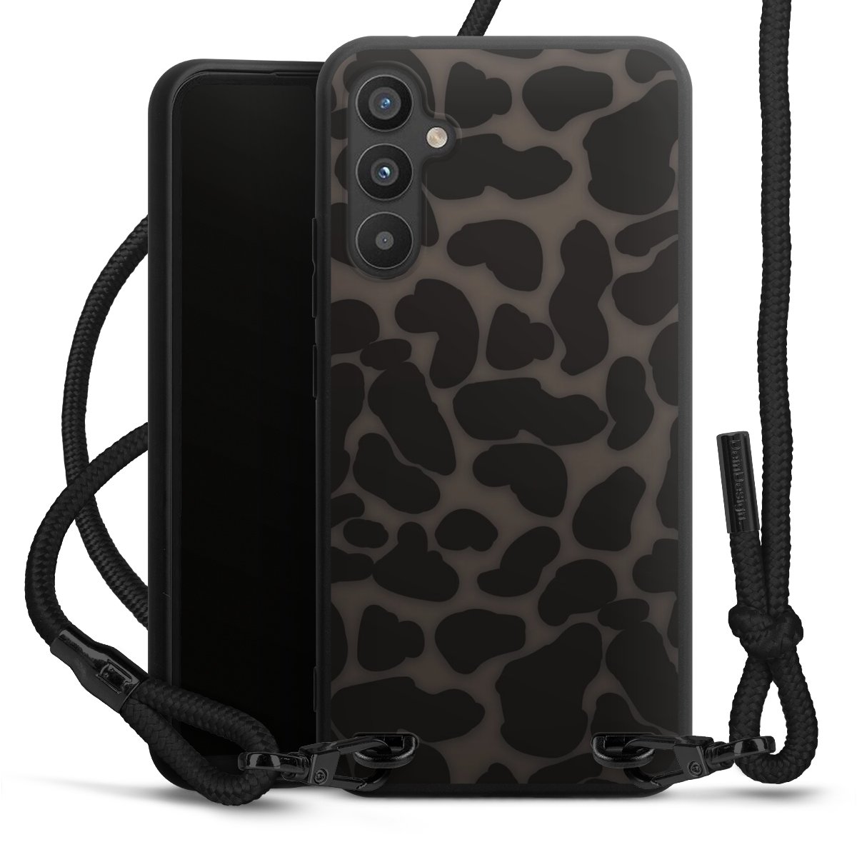 Pure Black: Handyhülle, Stoffband und Metalldetails in stylischem Mattschwarz.