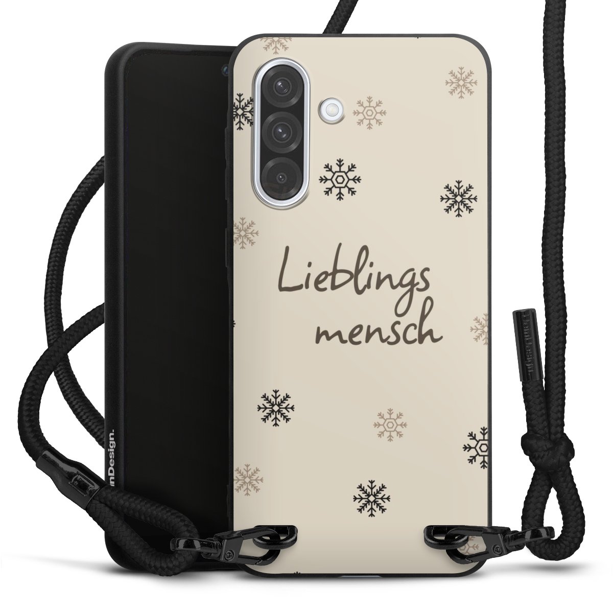 Pure Black: Handyhülle, Stoffband und Metalldetails in stylischem Mattschwarz.