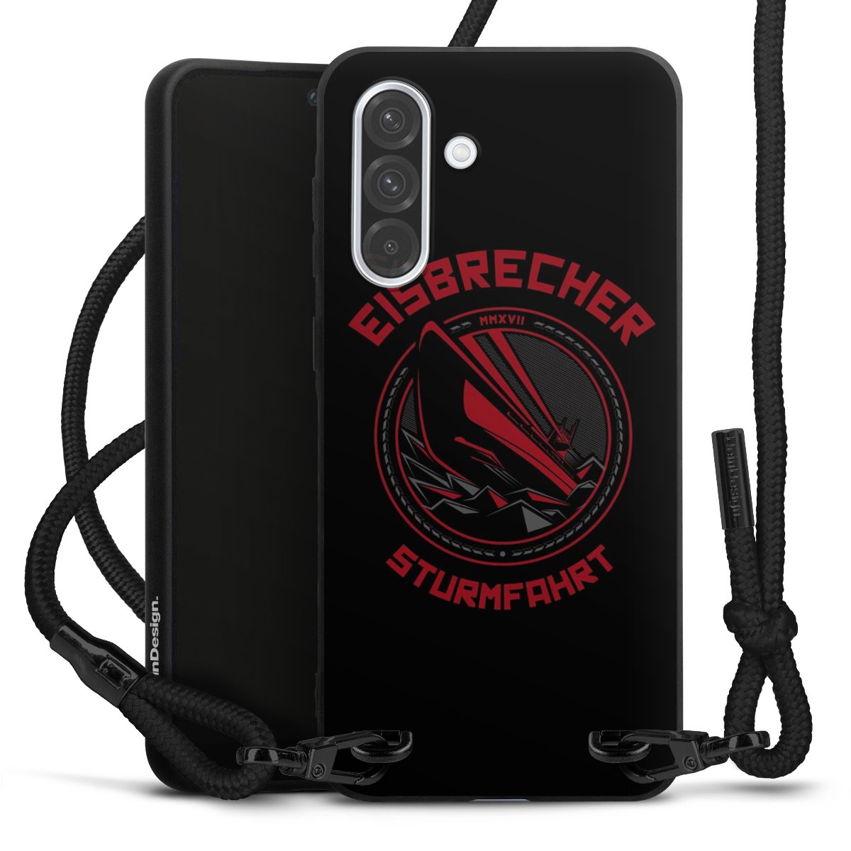 Pure Black: Handyhülle, Stoffband und Metalldetails in stylischem Mattschwarz.